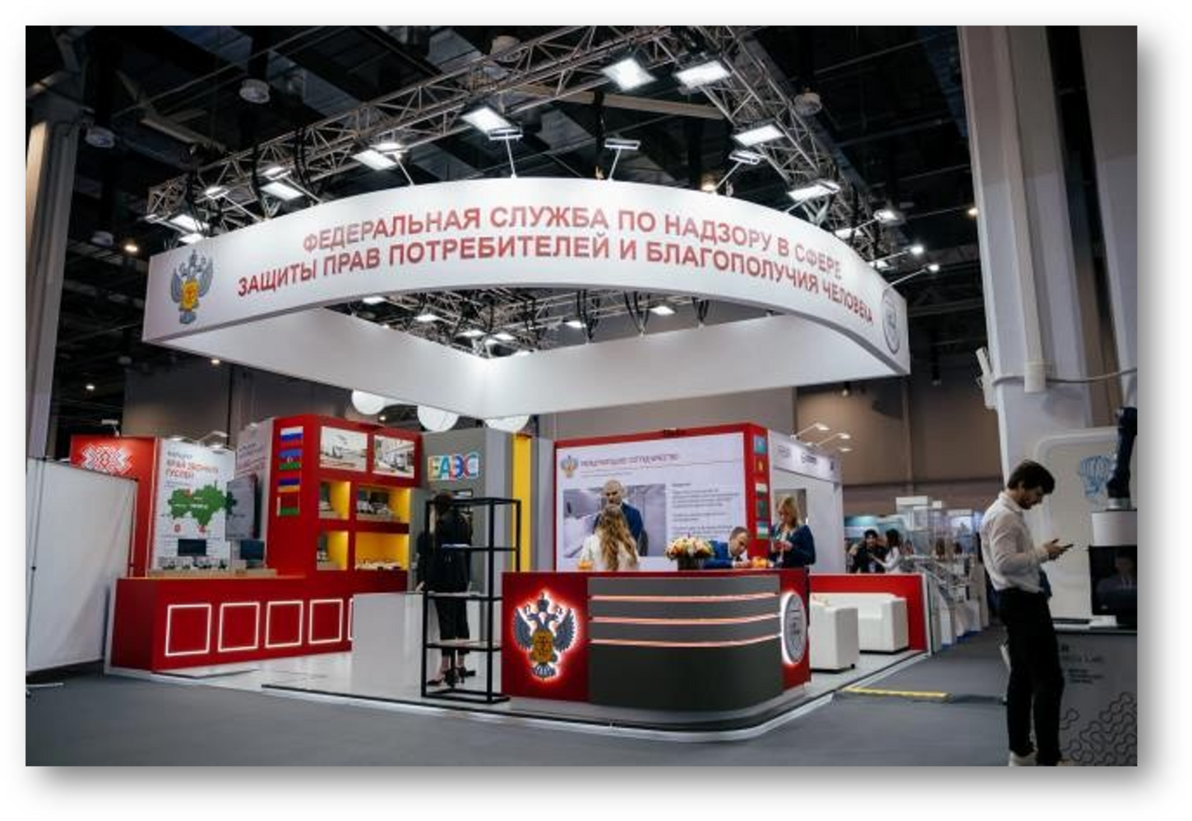 На стенде Роспотребнадзора была представлена информация о деятельности по реализации федерального проекта «Санитарный щит», а также были представлены макеты уникальных российских мобильных лабораторий, готовых работать в крупных городах и на отдаленных территориях.